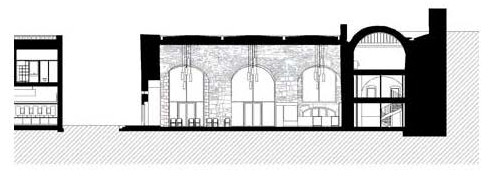 Die Reduktion auf wenige Materialien – Sandsteinmauerwerk, Holz, Terrazzo – unterstreicht die würdevolle Einfachheit des rechteckigen Raumes. Das bestehende Dach wurde durch ein dreiteiliges zinkgedecktes Dach ersetzt, das die historische Dreiteilung des Gebäudes aufnimmt. Der Innenraum wird als Bistro genutzt. Die lose Möblierung – Tische, Stühle und Theke - wurde ebenfalls von Max Dudler entwickelt.