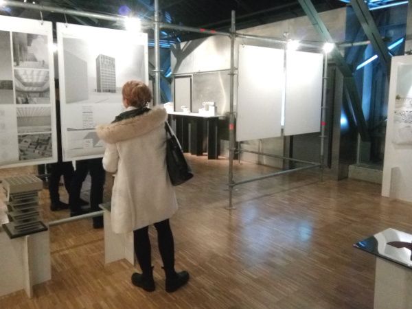 Die diesjährige Inszenierung der Preisverleihung war insgesamt ansprechender und wirkte raumfüllender als die Ausstellung im vorigen Jahr, dadurch dass im EG Foyer in Gebäude 1 der Länge nach viel Platz geschaffen wurde, um die Entwürfe zu präsentieren. Auf einem erhöhten Podest aus Holz fand die Preisverleihung statt. Zuerst sprach Prof. Karen Ehlers einleitende Worte. Danach übergab Dipl.-Ing. Udo Raabe die Preise einzeln an die Gewinner. Er begründete die Prämierung und ging in wenigen Worten auf die Gewinnerbeiträge ein. Erstaunlich gelungen waren die feinen Bleistiftzeichnungen auf großem Format. Heutzutage werden die meisten Zeichnungen ausschließlich mit computerbasierten CAD-Programmen erstellt, da diese um ein Vielfaches genauer arbeiten. Den untrüglichen Reiz der handgefertigten Zeichnung und die intensive Arbeit im Umgang mit Bleistift behalten die großformatigen Blätter. Tragen lebendiges Schaffen weiter. Nicht nur Preisgewinner waren in der Ausstellung bis 5. November ausgestellt, sondern zahlreiche Entwürfe und Wettbewerbseingaben wurden so offen zur Schau gebracht. Jeder der das Foyer während der Ausstellung besucht hat, konnte sich einen Eindruck verschaffen.