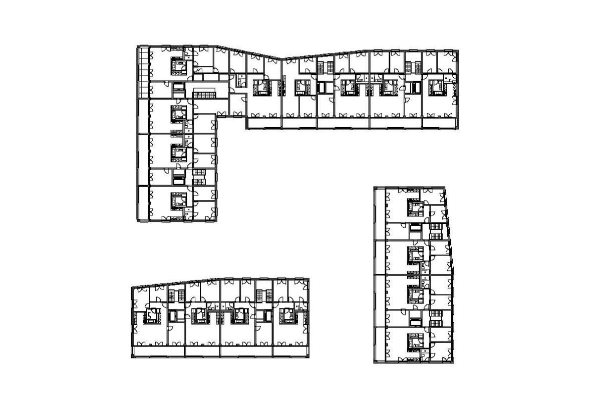 Modular konzipiert setzt sich das städtebauliche Ensemble aus der Wiederholung eines einfachen zeilenförmigen Baukörpers zusammen. Durch punktsymmetrische Spiegelung und Drehung des kubischen Volumens entsteht ein von windmühlenartig angeordneten Baukörpern gerahmter Platz. Die Elemente sind dabei so transformiert, dass die Bebauung sinnvoll auf den städtebaulichen Kontext reagiert. Der langgezogene L-förmige Baukörper im Norden schirmt die Wohnbebauung von der Fangletenstraße ab. Der Innenhof öffnet sich in alle anderen Himmelsrichtungen, sorgt für Licht in den Wohnungen und vernetzt den Ort mit dem Quartierspark und den Wegen, Höfen und Plätzen der Wohnfelder im Osten und Süden. So wird die Stadt Bülach an dieser Stelle bedacht weitergebaut. Es entsteht nicht nur ein Quartier, sondern ein sozial gedachtes, funktionierendes Stück Stadt. Durch bewusst gesetzte Knicke in den Gebäude-Volumen entstehen eindrückliche, skulpturale Baufiguren. Es ergeben sich spannungsvolle Perspektiven, in denen die Linien der Baukörper aufeinander verweisen und die Gebäude zu einem einheitlichen Ensemble gefügt werden. Die Knicke weiten den Raum und sorgen für einladende Gesten, 2/15 durch die der Außenraum ins Innere des Ensembles fließt, von wo die Wohnungen erschlossen werden. Der starke Bezug zum Außenraum am Übergang von Stadt und Landschaft wird auch in den Wohnungen deutlich. Mit ihren über die gesamte Fassadenlänge angelegten Loggien bieten sie den Bewohnern großzügige, am Sonnenstand ausgerichtete Außenflächen. Die Loggien wurden als filigrane, klar gegliederte Raumgitter aus Sichtbeton in die monolithischen Baukörper eigeschoben.